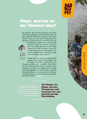 WARUM IST DAS SO?ChristianZitzmannVater einer3-J%u00e4hrigenPapa, warum ist der Himmel blau?Ich glaube, das war der Anfang vom Ende. Oder besser gesagt, der Anfang einer nicht enden wollenden Kette von %u201eWarums%u201c, die meine Tochter Maya mir seit ihrer Entdeckung der Sprache um die Ohren wirft. Als Vater, der sich f%u00fcr halbwegs gebildet h%u00e4lt, m%u00f6chte man nat%u00fcrlich immer eine Antwort parat haben. Doch schon bei dieser ersten Frage stotterte ich und murmelte etwas von %u201eLichtbrechung in der Atmosph%u00e4re%u201c, woraufhin Maya mich nur skeptisch ansah und nachhakte: %u201eAber warum?%u201cKinder sind von Natur aus kleine Philosophen. Die ewige Warum-Fragerei ist ihr Mittel, die Welt zu erkunden, ihre Neugier zu stillen und %u2013 nat%u00fcrlich %u2013 ihre Eltern an den Rand des Wahnsinns zu treiben. Laut Experten ist dieses Verhalten eine wichtige Entwicklungsphase. Es hilft Kindern, logische Zusammenh%u00e4nge zu verstehen und ihr Wissen zu strukturieren. Doch mal ehrlich, was machen wir Eltern daraus? Die Neugier der Kinder und ihre Frageketten sind Anzeichen f%u00fcr eine gesunde geistige Entwicklung.Untersuchungen zeigen, dass diese Art von Fragerei zu einem besseren Verst%u00e4ndnis von Ursache und Wirkung und zur St%u00e4rkung der kognitiven F%u00e4higkeiten beitr%u00e4gt.13