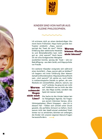 KINDER SIND VON NATUR AUS KLEINE PHILOSOPHEN.Ich erinnere mich an einen denkw%u00fcrdigen Moment beim Fr%u00fchst%u00fcck. Maya hatte gerade den Toaster entdeckt. %u201ePapa, warum springt der Toast da raus?%u201c Meine Erkl%u00e4rung %u00fcber elektrische Heizdr%u00e4hte und Bimetallstreifen kam nicht gut an. %u201eUnd warum?%u201c Noch bevor ich mir eine kindgerechte Metapher ausdenken konnte, sprang der Toast %u2013 wie zur Bekr%u00e4ftigung %u2013 aus dem Ger%u00e4t, und Maya juchzte vor Freude.Ein weiterer Klassiker ereignete sich w%u00e4hrend einer Autofahrt. %u201ePapa, warum gibt es Wolken?%u201c Ich begann mit einer Erkl%u00e4rung %u00fcber Wasserdampf und Kondensation. Maya lauschte aufmerksam. %u201eUnd warum?%u201c Ich setzte an, noch tieferin meteorologische Details zu gehen, als vom R%u00fccksitz ein verzweifeltes %u201eWarum, warum, warum?%u201c ert%u00f6nte. Da ging mir ein Licht auf: Vielleicht war es nicht das Wissen, das Maya suchte, sondern das Spiel mit meiner Geduld.Die Sache ist die: Kinder haben keine festgelegte Agenda. Sie fragen aus purem Interesse heraus, ohne Hintergedanken. Eltern hingegen %u2013 also ich in diesem Fall %u2013 f%u00fchlen sich schnell unter Druck gesetzt, die perfekte Antwort zu liefern. Doch warum nicht den Spie%u00df einmal umdrehen? Statt immer nur zu antworten, k%u00f6nnten wir anfangen, die Kinder mit unseren eigenen Warum-Fragen herauszufordern. Warum schmeckt Regen nicht nach Limo?Warumk%u00f6nnen Fische nicht k%u00fcssen?14