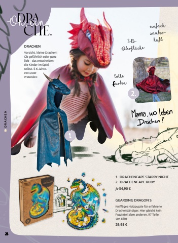 Oh, eintolle Farbeneinfachzauberhaft 3-DOberfl%u00e4cheGUARDING DRAGON S Kniffliges Holzpuzzle f%u00fcr erfahrene Drachenb%u00e4ndiger. Hier gleicht kein Puzzleteil dem anderen. 97 Teile. Von Elliot29,95 %u20acDRACHENVorsicht, kleine Drachen! Ob gef%u00e4hrlich oder ganz lieb %u2013 das entscheiden die Kinder im Spiel selbst. 5-6 Jahre. Von Great Pretenders1. DRACHENCAPE STARRY NIGHT2. DRACHENCAPE RUBYje 54,90 %u20ac2 .1.26DRACHEN