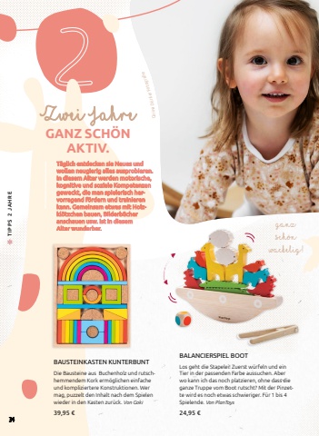 2BAUSTEINKASTEN KUNTERBUNTDie Bausteine aus Buchenholz und rutschhemmendem Kork erm%u00f6glichen einfache und kompliziertere Konstruktionen. Wer mag, puzzelt den Inhalt nach dem Spielen wieder in den Kasten zur%u00fcck. Von Goki39,95 %u20acBALANCIERSPIEL BOOTLos geht die Stapelei! Zuerst w%u00fcrfeln und ein Tier in der passenden Farbe aussuchen. Aber wo kann ich das noch platzieren, ohne dass die ganze Truppe vom Boot rutscht? Mit der Pinzette wird es noch etwas schwieriger. F%u00fcr 1 bis 4 Spielende. Von PlanToys24,95 %u20acGANZ SCH%u00d6N AKTIV.Zwei Jahre Car ni a D%u00fcrr el r Fotografeganz sch%u00f6n wackelig!T%u00e4glich entdecken sie Neues und wollen neugierig alles ausprobieren. In diesem Alter werden motorische, kognitive und soziale Kompetenzen geweckt, die man spielerisch hervorragend f%u00f6rdern und trainieren kann. Gemeinsam etwas mit Holzkl%u00f6tzchen bauen, Bilderb%u00fccher anschauen usw. ist in diesem Alter wunderbar.34 TIPPS 2 JAHRE