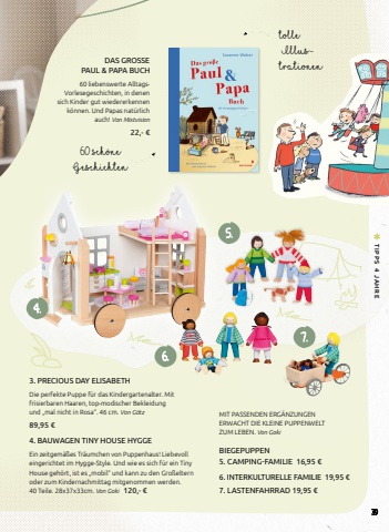DAS GROSSE PAUL & PAPA BUCH60 liebenswerte AlltagsVorlesegeschichten, in denen sich Kinder gut wiedererkennen k%u00f6nnen. Und Papas nat%u00fcrlich auch! Von Mixtvision22,- %u20ac5.tolle Illustrationen60 sch%u00f6neGeschichten4.6.7.4. BAUWAGEN TINY HOUSE HYGGEEin zeitgem%u00e4%u00dfes Tr%u00e4umchen von Puppenhaus! Liebevoll eingerichtet im Hygge-Style. Und wie es sich f%u00fcr ein Tiny House geh%u00f6rt, ist es %u201emobil%u201c und kann zu den Gro%u00dfeltern oder zum Kindernachmittag mitgenommen werden. 40 Teile. 28x37x33cm. Von Goki 120,- %u20ac3. PRECIOUS DAY ELISABETHDie perfekte Puppe f%u00fcr das Kindergartenalter. Mit frisierbaren Haaren, top-modischer Bekleidung und %u201emal nicht in Rosa%u201c. 46 cm. Von G%u00f6tz89,95 %u20acMIT PASSENDEN ERG%u00c4NZUNGEN ERWACHT DIE KLEINE PUPPENWELT ZUM LEBEN. Von GokiBIEGEPUPPEN 5. CAMPING-FAMILIE 16,95 %u20ac6. INTERKULTURELLE FAMILIE 19,95 %u20ac7. LASTENFAHRRAD 19,95 %u20ac39 TIPPS 4 JAHRE