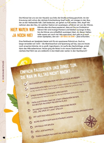 WOGE H T SAL S N %u00c4C H S T E S H I N ?Hier waren wir ja noch nie!Die M%u00fcnze hat uns von der Haust%u00fcr aus links die Stra%u00dfe entlang geschickt. An der Kreuzung naht schon die n%u00e4chste Entscheidung: Kopf hei%u00dft, wir steigen in den Bus, der an der Haltestelle h%u00e4lt. Zahl bedeutet, wir gehen zu Fu%u00df weiter. Ahh, Kopf! Wir nehmen also den Bus. An welcher Station wir aussteigen, erfahren wir von der M%u00fcnze. K%u00f6nnte also durchaus passieren, dass wir bis zur Endstation fahren! Wir sind mutige Pioniere und bleiben so lange im Bus, bis die M%u00fcnze uns schlie%u00dflich austeigen l%u00e4sst. An dieser Haltestelle waren wir noch nie! Wie spannend, dort gibt es ja auch einen Spielplatz, den wir %u2013 der M%u00fcnze sei Dank! %u2013 jetzt erkunden. Eine Parkbank am Spielplatz bietet sich f%u00fcr ein spontanes Picknick an. Doch zu lange verweilen wir nicht %u2013 die Abenteuerlust und Spannung auf das, was uns heute noch erwarten k%u00f6nnte, ist zu gro%u00df. Irgendwann, im Laufe des Nachmittags, endet dann das Mikroabenteuer. Heute ging die Reise in ein neues Stadtviertel %u2013 das n%u00e4chste Mal f%u00fchrt sie uns vielleicht in den Wald oder weiter in den Nachbarort? Einfach rausgehen und Dinge tun, die man im Alltag nicht macht:ZELTLAGER AUF DEM BALKON MIT FR%u00dcHST%u00dcCK IM FREIENDRAUSSEN KOCHEN (Die fortgeschrittene Variante des mitgebrachten Picknicks ist das Kochen im Freien. Dazu braucht ihr einen Gaskocher und einen Topf. )EINEN SONNENUNTERGANG ANSCHAUEN (insbesondere f%u00fcr kleinere Kinder toll, die normalerweise dann schon im Bett sind)FR%u00dcH AUFSTEHEN UND DIE STADT ERWACHEN SEHEN, AM BESTEN AN EINEM BELEBTEN PLATZIM GARTEN ODER PARK EINEN PARCOURS BAUENUND %u201eDIE ERDE IST LAVA%u201c SPIELENMIT DER TASCHENLAMPE EINE NACHTWANDERUNG UNTERNEHMENBLIND (DURCH DEN WALD) F%u00dcHREN LASSENEIN WALD-TIPI BAUENM%u00dcLL AUFSAMMELNEINEN GANZEN NACHMITTAG BARFUSS LAUFEN48MIKROABENTEUER
