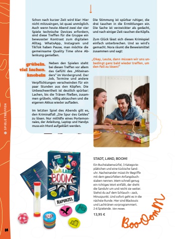 STADT, LAND, BOOM!Ein Buchstabenw%u00fcrfel, 3 Kategoriepl%u00e4ttchen und eine t%u00fcckische Sanduhr. Nacheinander m%u00fcsst ihr Begriffe mit dem gew%u00fcrfelten Anfangsbuchstaben nennen. Wem schnell genug ein richtiges Wort einf%u00e4llt, der dreht die Sanduhr um und reicht sie weiter. Stehst du auf dem Schlauch %u2013 zack, Minuspunkt. Und sofort geht es in die n%u00e4chste Runde. Hier sind Blackouts und Lachtr%u00e4nen vorprogrammiert. 2-6 Spielende. Von moses.13,95 %u20acBooOomMBooOomMgr%u00fcbeln,viel lachen,knobelnSchon nach kurzer Zeit wird klar: Hier nicht mitzusingen, ist quasi unm%u00f6glich.Auch wenn heute Abend zwei der vierSpiele technische Devices erfordern, sind diese Treffen f%u00fcr die Gruppe ein bewusster Kontrast zum digitalen Alltag. WhatsApp, Instagram und TikTok haben Pause, man m%u00f6chte diegemeinsame Quality Time ohne Ablenkung genie%u00dfen.Neben den Spielen steht bei diesen Treffen vor allem das Gef%u00fchl des %u201eMiteinanders%u201c im Vordergrund. Der Job, Termine und andere Verpflichtungen verschwinden f%u00fcr ein paar Stunden aus den K%u00f6pfen. Die Unbeschwertheit ist deutlich sp%u00fcrbar: Lachen, bis die Tr%u00e4nen flie%u00dfen, zusammen gr%u00fcbeln, v%u00f6llig abtauchen und die eigenen Akkus wieder aufladen.Im letzten Spiel des Abends gilt es, den Kriminalfall %u201eDie Spur des Geldes%u201c zu l%u00f6sen. Nur mithilfe eines Portemonnaies, der Anleitung, Laptop und Handysmuss ein Mord aufgekl%u00e4rt werden. Die Stimmung ist sp%u00fcrbar ruhiger, die drei tauchen in die Ermittlungen ein. Die Sache ist verzwickter als gedacht, und nach einiger Zeit rauchen die K%u00f6pfe. Zum Gl%u00fcck l%u00e4sst sich dieses Krimispiel einfach unterbrechen. Und so wird%u2019s gemacht. Nora r%u00e4umt die Beweismittel zusammen und sagt: %u201eOkay, Leute, dann m%u00fcssen wir uns unbedingt ganz bald wieder treffen, um den Fall zu l%u00f6sen!%u201c64 S P I E L E T R E F F E N