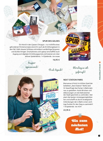 NEXT STATION PARISBienvenue %u00e0 Paris! Im dritten Spiel der beliebten %u201eNext Station%u201c Reihe seid ihr beauftragt das Pariser U-Bahnnetz neu zu gestalten. Nutzt Br%u00fccken und Abk%u00fcrzungen um die Wahrzeichen der Stadt geschickt zu verbinden. Wer plant die besten Umsteigem%u00f6glichkeiten und schafft es durch strategische Anbindungen der U-Bahn Linien wichtige Punkte f%u00fcr den Sieg zu sammeln? 1-8 Spielende. Von HCM22,95 %u20acSPUR DES GELDESEin Mord in den Gassen Chicagos %u2013 nur mithilfe eines gefundenen Portemonnaies st%u00fcrzt ihr euch als Ermittlungsteam in den Fall. Zieht clevere Schl%u00fcsse und entlarvt verd%u00e4chtige Personen und dunkle Intrigen. Smartphones und Laptop verschaffen euch Zugang zum digitalen Ermittlungsportal und kreieren ein interaktives Spielerlebnis. 1-4 Spielende. Von moses. 16,95 %u20acSuper spannend! Strategie ist gefragt! Viel Spa%u00df!Bis zum n%u00e4chsten Mal!65