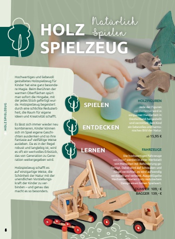 HOLZSPIELZEUGHochwertiges und liebevoll gestaltetes Holzspielzeug f%u00fcr Kinder hat eine ganz besondere Magie. Beim Ber%u00fchren der warmen Oberfl%u00e4chen sp%u00fcrt man sofort die Hingabe, mit der jedes St%u00fcck gefertigt wurde. Holzspielzeug begeistert durch eine schlichte Reduziertheit, die Raum f%u00fcr eigene Ideen und Kreativit%u00e4t schafft. Es l%u00e4sst sich immer wieder neu kombinieren, Kinder k%u00f6nnen sich im Spiel eigene Geschichten ausdenken und so ihre Fantasie auf vielf%u00e4ltige Weise ausleben. Da es in der Regel robust und langlebig ist, wird es oft ein wertvolles Erbst%u00fcck, das von Generation zu Generation weitergegeben wird. Holzspielzeug schafft es auf einzigartige Weise, die Sch%u00f6nheit der Natur mit der unendlichen Vorstellungskraft der Kinder zu verbinden %u2013 und genau das macht es so besonders.HOLZSPIELZEUGNat%u00fcrlich SpielenHOLZFIGURENJede der Figuren von Ostheimer wird in sorgsamer Handarbeit in Deutschland hergestellt und vermittelt dem Kind ein liebevolles und harmonisches Bild der Natur.ab 15,95 %u20acFAHRZEUGEDie hochwertigen Fahrzeuge von fagus %u00ae werden in einer Werkstatt von Menschen mit Behinderung gefertigt. Dabei wird auf Schrauben und N%u00e4gel verzichtet, es wird aufwendig verd%u00fcbelt und verleimt. Ausgekl%u00fcgelte Mechaniken bieten trotz reduziertem Design einen hohen Spielwert.DUMPER 109,- %u20acBAGGER 139,- %u20acSPIELEN LERNEN ENTDECKEN 8