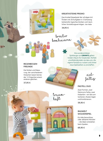 REGENBOGENFREUNDEDie Farben und Maserung der verschiedenen Holzarten lassen keines der 12 P%u00fcppchen einem anderen gleichen.37,95 %u20acPASTELL DUOZwei Formen, zwei Steine pro Farbe, zwei Holzarten %u2013 ein Set zum Sortieren, Muster legen und Kombinieren. 59,95 %u20acvielf%u00e4ltigkreativ kombinierenDie wundersch%u00f6nen Spielzeuge von GRIMM%u2018S geben Kindern Raum f%u00fcr Kreativit%u00e4t. Perfekt unvollst%u00e4ndig laden sie dazu ein, die eigene Fantasie zu nutzen und immer neue Spielwelten zu erschaffen.KREATIVSTEINE PRISMODas Knobel-Stapelspiel der schr%u00e4gen Art f%u00f6rdert mit 20 Aufgaben in 3 Schwierigkeitsstufen logisches Denken und r%u00e4umliches Vorstellungsverm%u00f6gen. Von Haba34,95 %u20acBAUWELT WOLKENSPIELEin M%u00e4rchenschlossoder seltsame Monster %u2013 die Ideen entstehen beim Spielen.69,95 %u20actraumhaft40 TEILE9