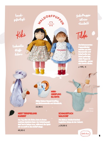 liebevolle StoffdekoreDie liebenswerten Puppenkinder werden aus BioBaumwolle und Schafwolle von Hand gefertigt. Jede Puppe ist einzigartig %u2013 genau wie unsere Kinder.je 199,- %u20acJede Puppe ist ein Unikat!handgefertigt Kiki TildaNEST TIERSPIELUHR KARIERTAm Tag sitzt die kleine Ente in ihrem weichen Spieluhr-Nest. Zur Schlafenszeit darf sie in Babys Arm, w%u00e4hrend die Spieluhr es sanft in den Schlaf wiegt.49,90 %u20acSCHMUSETUCH WALDORFDie kleinen Waldorfwichtel begleiten Babys ab der Geburt. je 29,90 %u20acT%u00fcrkis oder RosaMINIGREIFLING ELI ENTES%u00fc%u00dfer kleiner Rassel-Greifling aus Biobaumwolle und Kirschholz.22,90 %u20acWALDORFPUPPENaus Biowolle11