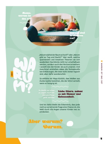 ABER%u201eWarum w%u00e4chst der Baum so hoch?%u201c oder %u201eWarumgibt es Tag und Nacht?%u201c Wer wei%u00df, welche spannenden und kreativen Theorien sie sich ausdenken! Das k%u00f6nnte nicht nur unterhaltsam werden, sondern auch den Horizont erweitern %u2013 sowohl den der Kinder als auch unseren. Und manchmal entstehen dabei die fantasievollsten Erkl%u00e4rungen, die zwar nicht immer logisch sind, aber daf%u00fcr wundersch%u00f6n. So erkl%u00e4rte mir Maya k%u00fcrzlich, dass Wolken aus Zuckerwatte bestehen, die der Wind verteilt, wenn er hungrig ist.Und bis dahin bleibt die Erkenntnis, dass jede noch so verwirrende Frage eine Chance ist, die Welt durch die Augen unserer Kinder neu zu entdecken. Liebe Eltern, nehmt es mit Humor und Gelassenheit.So bleibt nur eines zu sagen: Auch die Warum-Phase geht vor%u00fcber.Aber warum?Darum.Papa, warum sind Erdbeeren rot?Mama,warum ist das so?15WARUM IST DAS SO?