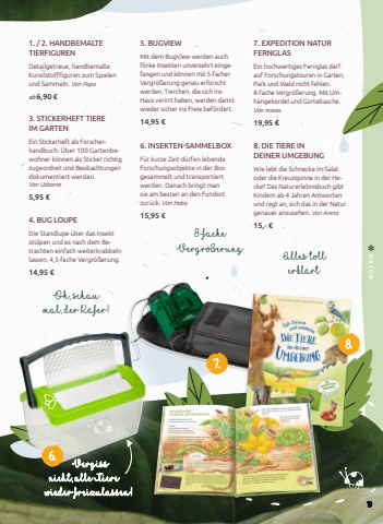 6. Vergiss nicht, alle Tiere wieder freizulassen!Oh, schau mal, der K%u00e4fer!Alles toll erkl%u00e4rt 8-facheVergr%u00f6%u00dferung7. EXPEDITION NATUR FERNGLASEin hochwertiges Fernglas darf auf Forschungstouren in Garten, Park und Wald nicht fehlen. 8-fache Vergr%u00f6%u00dferung. Mit Umh%u00e4ngekordel und G%u00fcrteltasche. Von moses. 19,95 %u20ac4. BUG LOUPEDie Standlupe %u00fcber das Insekt st%u00fclpen und es nach dem Betrachten einfach weiterkrabbeln lassen. 4,5-fache Vergr%u00f6%u00dferung.14,95 %u20ac5. BUGVIEWMit dem BugView werden auch flinke Insekten unversehrt eingefangen und k%u00f6nnen mit 5-facher Vergr%u00f6%u00dferung genau erforscht werden. Tierchen, die sich ins Haus verirrt haben, werden damit wieder sicher ins Freie bef%u00f6rdert. 14,95 %u20ac6. INSEKTEN-SAMMELBOXF%u00fcr kurze Zeit d%u00fcrfen lebende Forschungsobjekte in der Box gesammelt und transportiert werden. Danach bringt man sie am besten an den Fundort zur%u00fcck. Von Haba 15,95 %u20ac8. DIE TIERE IN DEINER UMGEBUNGWie lebt die Schnecke im Salat oder die Kreuzspinne in der Hecke? Das Naturerlebnisbuch gibt Kindern ab 4 Jahren Antworten und regt an, sich das in der Natur genauer anzusehen. Von Arena15,- %u20ac3. STICKERHEFT TIERE IM GARTENEin Stickerheft als Forscherhandbuch: %u00dcber 100 Gartenbewohner k%u00f6nnen als Sticker richtig zugeordnet und Beobachtungen dokumentiert werden. Von Usborne5,95 %u20ac1. / 2. HANDBEMALTE TIERFIGURENDetailgetreue, handbemalte Kunststofffiguren zum Spielen und Sammeln. Von Papo ab 6,90 %u20ac7.6.8.19NATUR