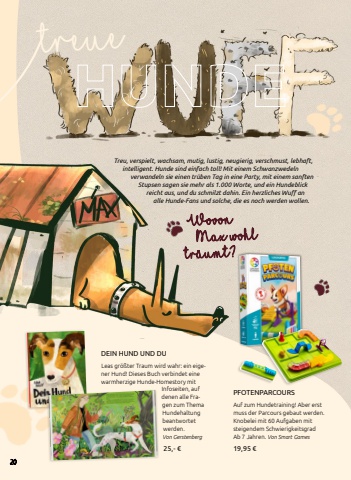 treueHUNDETreu, verspielt, wachsam, mutig, lustig, neugierig, verschmust, lebhaft, intelligent. Hunde sind einfach toll! Mit einem Schwanzwedeln verwandeln sie einen tr%u00fcben Tag in eine Party, mit einem sanften Stupsen sagen sie mehr als 1.000 Worte, und ein Hundeblick reicht aus, und du schmilzt dahin. Ein herzliches Wuff an alle Hunde-Fans und solche, die es noch werden wollen.PFOTENPARCOURSAuf zum Hundetraining! Aber erst muss der Parcours gebaut werden. Knobelei mit 60 Aufgaben mit steigendem SchwierigkeitsgradAb 7 Jahren. Von Smart Games19,95 %u20ac Wovon Max wohl tr%u00e4umt? DEIN HUND UND DULeas gr%u00f6%u00dfter Traum wird wahr: ein eigener Hund! Dieses Buch verbindet eine warmherzige Hunde-Homestory mit Infoseiten, auf denen alle Fragen zum Thema Hundehaltung beantwortet werden. Von Gerstenberg25,- %u20ac20