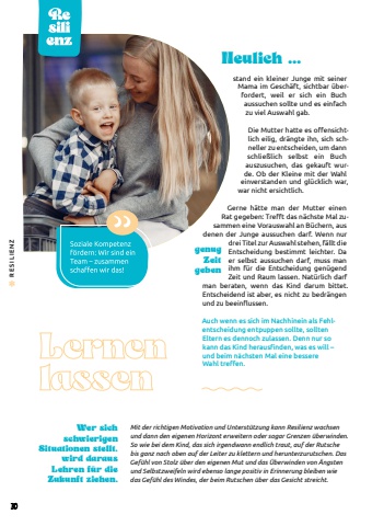 Mit der richtigen Motivation und Unterst%u00fctzung kann Resilienz wachsen und dann den eigenen Horizont erweitern oder sogar Grenzen %u00fcberwinden. So wie bei dem Kind, das sich irgendwann endlich traut, auf der Rutsche bis ganz nach oben auf der Leiter zu klettern und herunterzurutschen. Das Gef%u00fchl von Stolz %u00fcber den eigenen Mut und das %u00dcberwinden von %u00c4ngsten und Selbstzweifeln wird ebenso lange positiv in Erinnerung bleiben wie das Gef%u00fchl des Windes, der beim Rutschen %u00fcber das Gesicht streicht. Wer sich schwierigen Situationen stellt, wird daraus Lehren f%u00fcr die Zukunft ziehen. Neulich ... stand ein kleiner Junge mit seiner Mama im Gesch%u00e4ft, sichtbar %u00fcberfordert, weil er sich ein Buch aussuchen sollte und es einfach zu viel Auswahl gab. Die Mutter hatte es offensichtlich eilig, dr%u00e4ngte ihn, sich schneller zu entscheiden, um dann schlie%u00dflich selbst ein Buch auszusuchen, das gekauft wurde. Ob der Kleine mit der Wahl einverstanden und gl%u00fccklich war, war nicht ersichtlich. Gerne h%u00e4tte man der Mutter einen Rat gegeben: Trefft das n%u00e4chste Mal zusammen eine Vorauswahl an B%u00fcchern, aus denen der Junge aussuchen darf. Wenn nur drei Titel zur Auswahl stehen, f%u00e4llt die Entscheidung bestimmt leichter. Da er selbst aussuchen darf, muss man ihm f%u00fcr die Entscheidung gen%u00fcgend Zeit und Raum lassen. Nat%u00fcrlich darf man beraten, wenn das Kind darum bittet. Entscheidend ist aber, es nicht zu bedr%u00e4ngen und zu beeinflussen. Auch wenn es sich im Nachhinein als Fehlentscheidung entpuppen sollte, sollten Eltern es dennoch zulassen. Denn nur so kann das Kind herausfinden, was es will %u2013 und beim n%u00e4chsten Mal eine bessereWahl treffen. genug Zeit geben30RESILIENZ
