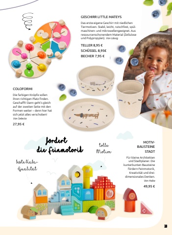 COLOFORMIDie farbigen Kn%u00f6pfe sollen ihren richtigen Platz finden. Geschafft! Dann geht%u2019s gleich auf der zweiten Seite mit den Formen weiter %u2013 denn hier hat sich jetzt alles verschoben! Von Selecta27,95 %u20acGESCHIRR LITTLE MATEYSDas erste eigene Geschirr mit niedlichen Tiermotiven. Stabil, leicht, rutschfest, sp%u00fclmaschinen- und mikrowellengeeignet. Aus ressourcenschonendem Material (Zellulose und Polypropylen). Von L%u00e4ssig f%u00f6rdert die FeinmotorikMOTIVBAUSTEINE STADTF%u00fcr kleine Architekten und Stadtplaner. Die kunterbunten Bausteine f%u00f6rdern Feinmotorik, Kreativit%u00e4t und dreidimensionales Denken. Von Haba49,95 %u20acTELLER 8,95 %u20acSCH%u00dcSSEL 8,95%u20acBECHER 7,95 %u20acbeste HabaQualit%u00e4ttolle Motive33