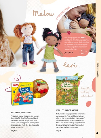VIEL LOS IN DER NATURNaturkinder aufgepasst! Bei einer Wanderung durch Feld, Wald und Wiesen gibt es viel zu entdecken. Hier %u201elesen%u201c die Kinder selbst, indem sie Felix und Malia auf ihrem Ausflug begleiten und Dinge und Szenen in den Wimmelbildern beschreiben. Von Loewe10,- %u20acMalouEs gibt viel zu entdecken!STOFFPUPPENENTE HUT, ALLES GUT!Findet die kleine Holzente die passenden H%u00fcte f%u00fcr ihre Tierfreunde? Zwei Varianten und die M%u00f6glichkeit zum freien Spiel erm%u00f6glichen einen guten Einstieg in die Welt der Gesellschaftsspiele. Von Haba24,95 %u20ac Cariwaschbar bei 30%u00b0Die Stoffpuppen von HABAsind durch ihre K%u00f6rperproportionen, Kleidung und Gesichtsz%u00fcgeso gestaltet, dass sich Krippenund Kindergartenkinder darin wiedererkennen. je 32,95 %u20ac35 TIPPS 2 JAHRE