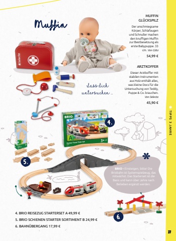 Lass dich untersuchen ...4. BRIO REISEZUG STARTERSET A 49,99 %u20ac5. BRIO SCHIENEN STARTER SORTIMENT B 24,99 %u20ac6. BAHN%u00dcBERGANG 17,99 %u20acARZTKOFFERDieser Arztkoffer mit stabilen Instrumenten aus Holz enth%u00e4lt alles, was kleine Docs f%u00fcr die Untersuchung von Teddy, Puppe & Co. brauchen. Von Selecta45,90 %u20acMUFFIN GL%u00dcCKSPILZDer anschmiegsame K%u00f6rper, Schlafaugen und Schnuller machen den knuffigen Muffin zur Bestbesetzung als erste Babypuppe. 33 cm. Von G%u00f6tz54,99 %u20acMuffinBRIO - Einsteigen, bitte! Die Briobahn ist Systemspielzeug, das mitw%u00e4chst. Das Starterset ist die Basis und kann %u00fcber Jahre nach Belieben erg%u00e4nzt werden.4 .5 .6.37 TIPPS 3 JAHRE
