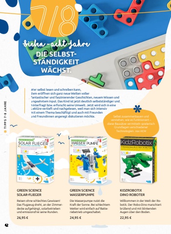7/8Wer selbst lesen und schreiben kann, dem er%u00f6ffnen sich ganz neue Welten voller fantastischer und faszinierender Geschichten, neuem Wissen und ungeahntem Input. Das Kind ist jetzt deutlich selbstst%u00e4ndiger und hinterfragt bzw. erforscht seine Umwelt. Jetzt wird sich in eine Lekt%u00fcre vertieft und nachgelesen, weil man sich intensiv mit einem Thema besch%u00e4ftigt und auch mit Freunden und Freundinnen angeregt diskutieren m%u00f6chte.GREEN SCIENCE SOLAR-FLIEGERReisen ohne schlechtes Gewissen! Das Flugzeug dreht, an der Zimmerdecke aufgeh%u00e4ngt, solarbetrieben und emissionsfrei seine Runden.26,95 %u20acKIDZROBOTIX DINO ROBOTERWillkommen in der Welt der Robotik. Der Robo-Dino marschiert br%u00fcllend und mit blinkenden Augen %u00fcber den Boden.22,95 %u20acGREEN SCIENCE WASSERPUMPEDie Wasserpumpe nutzt die Kraft der Sonne. Bei schlechtem Wetter wird einfach auf Batteriebetrieb umgeschaltet.24,95 %u20acSieben - acht JahreDIE SELBSTST%u00c4NDIGKEIT W%u00c4CHST.Selbst zusammenbauen und verstehen, wie es funktioniert %u2013 diese Baus%u00e4tze vermitteln spielerisch Grundlagen verschiedener Technologien. Von HCM42 TIPPS 7-8 JAHRE