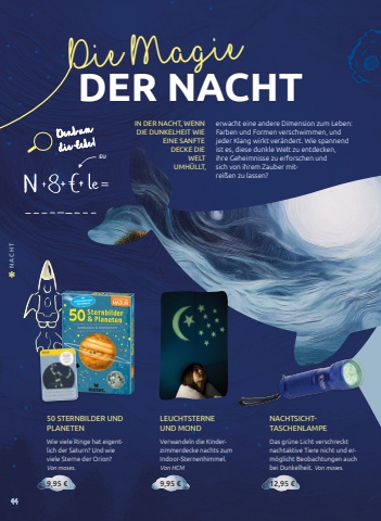 Die Magieerwacht eine andere Dimension zum Leben: Farben und Formen verschwimmen, und jeder Klang wirkt ver%u00e4ndert. Wie spannend ist es, diese dunkle Welt zu entdecken, ihre Geheimnisse zu erforschen und sich von ihrem Zauber mitrei%u00dfen zu lassen?IN DER NACHT, WENN DIE DUNKELHEIT WIE EINE SANFTE DECKE DIE WELT UMH%u00dcLLT, DER NACHTNACHTSICHTTASCHENLAMPEDas gr%u00fcne Licht verschreckt nachtaktive Tiere nicht und erm%u00f6glicht Beobachtungen auch bei Dunkelheit. Von moses.12,95 %u20acLEUCHTSTERNE UND MONDVerwandeln die Kinderzimmerdecke nachts zum Indoor-Sternenhimmel. Von HCM9,95 %u20ac50 STERNBILDER UND PLANETENWie viele Ringe hat eigentlich der Saturn? Und wie viele Sterne der Orion? Von moses.9,95 %u20acDenk um die Ecke!EU44 NACHT