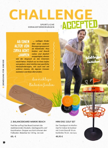 ... verf%u00fcgen Kinder %u00fcber einen anderen Bewegungsapparat als Kleinkinder. Muskulatur und Koordination sind deutlich ausgepr%u00e4gter, ebenso wie der Anspruch an den Entertainment-Faktor: Einfach nur im Kreis laufen war gestern. Jetzt m%u00f6chte man sportliche Herausforderungen, sich auch mal mit anderen messen, die eigenen Grenzen austesten und diese %u00fcberwinden.Ab einem Alter von zirka acht JahrenMINI DISC GOLF SETDer Trendsport im Miniformat f%u00fcr Indoor & Outdoor mit 5 mini Discs %u00d8 10 cm. Korbh%u00f6he 70 cm. Von Guru49,95 %u20ac2. BALANCEBOARD WAIKIKI BEACHFeel like surfing! Das Board trainiert die stabilisierenden Muskeln, Gleichgewicht und Koordination. Stopper aus Kork schonen den Fu%u00dfboden. Belastbar bis 120 kg. Von Goki69,- %u20acCHALLENGEAccepted SPORTLICHEHERAUSFORDERUNGENdie richtige Balance findenJetzt triffst du sicher!50BEWEGUNG F%u00dcR GROSSE