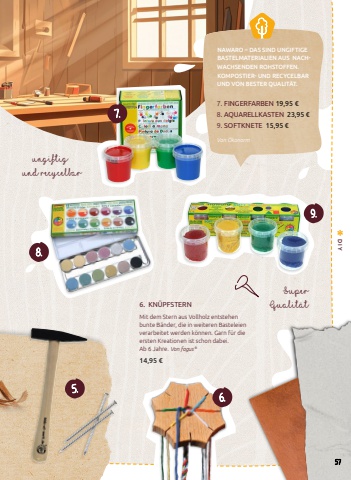 6. KN%u00dcPFSTERNMit dem Stern aus Vollholz entstehen bunte B%u00e4nder, die in weiteren Basteleien verarbeitet werden k%u00f6nnen. Garn f%u00fcr die ersten Kreationen ist schon dabei. Ab 6 Jahre. Von fagus %u00ae14,95 %u20ac ungiftig und recycelbarSuperQualit%u00e4t5.NAWARO %u2013 DAS SIND UNGIFTIGE BASTELMATERIALIEN AUS NACHWACHSENDEN ROHSTOFFEN. KOMPOSTIER- UND RECYCELBAR UND VON BESTER QUALIT%u00c4T. 7. FINGERFARBEN 19,95 %u20ac8. AQUARELLKASTEN 23,95 %u20ac9. SOFTKNETE 15,95 %u20ac7.9.Von %u00d6konorm8.6.57DIY