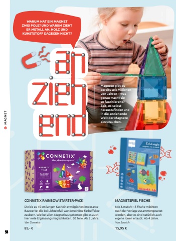 MAGNETSPIEL FISCHEMix & match! 15 Fische m%u00f6chten nach der Vorlage zusammengesetzt werden, aber es sind nat%u00fcrlich auch eigene Ideen erlaubt. Ab 4 Jahre. Von Scratch15,95 %u20acWARUM HAT EIN MAGNET ZWEI POLE? UND WARUM ZIEHT ER METALL AN, HOLZ UND KUNSTSTOFF DAGEGEN NICHT?Magnete gibt es bereits seit Millionen von Jahren %u2013 was genau macht sie so faszinierend? Zeit, es selbst herauszufinden und in die anziehende Welt der Magnete einzutauchen.CONNETIX RAINBOW STARTER-PACKDie bis zu 15 cm langen Kacheln erm%u00f6glichen imposante Bauwerke, die bei Lichteinfall wundersch%u00f6ne Farbeffekte zaubern. Wie bei allen Magnetbausystemen gibt es auch hier viele Erg%u00e4nzungsm%u00f6glichkeiten. 60 Teile. Ab 3 Jahre. Von Connetix85,- %u20ac58 MAGNET