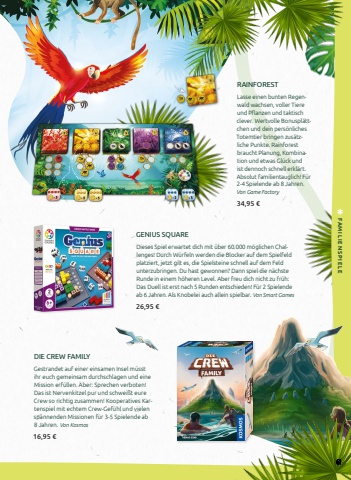 GENIUS SQUAREDieses Spiel erwartet dich mit %u00fcber 60.000 m%u00f6glichen Challenges! Durch W%u00fcrfeln werden die Blocker auf dem Spielfeld platziert, jetzt gilt es, die Spielsteine schnell auf dem Feld unterzubringen. Du hast gewonnen? Dann spiel die n%u00e4chste Runde in einem h%u00f6heren Level. Aber freu dich nicht zu fr%u00fch: Das Duell ist erst nach 5 Runden entschieden! F%u00fcr 2 Spielende ab 6 Jahren. Als Knobelei auch allein spielbar. Von Smart Games26,95 %u20acRAINFORESTLasse einen bunten Regenwald wachsen, voller Tiere und Pflanzen und taktisch clever. Wertvolle Bonuspl%u00e4ttchen und dein pers%u00f6nliches Totemtier bringen zus%u00e4tzliche Punkte. Rainforest braucht Planung, Kombination und etwas Gl%u00fcck und ist dennoch schnell erkl%u00e4rt. Absolut familientauglich! F%u00fcr 2-4 Spielende ab 8 Jahren. Von Game Factory34,95 %u20acDIE CREW FAMILYGestrandet auf einer einsamen Insel m%u00fcsst ihr euch gemeinsam durchschlagen und eine Mission erf%u00fcllen. Aber: Sprechen verboten! Das ist Nervenkitzel pur und schwei%u00dft eure Crew so richtig zusammen! Kooperatives Kartenspiel mit echtem Crew-Gef%u00fchl und vielen spannenden Missionen f%u00fcr 3-5 Spielende ab 8 Jahren. Von Kosmos16,95 %u20ac61 FAMILIENSPIELE