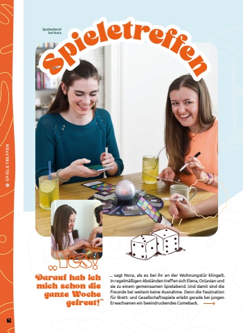 ... sagt Nora, als es bei ihr an der Wohnungst%u00fcr klingelt. In regelm%u00e4%u00dfigen Abst%u00e4nden treffen sich Elena, Octavian und sie zu einem gemeinsamen Spielabend. Und damit sind die Freunde bei weitem keine Ausnahme. Denn die Faszination f%u00fcr Brett- und Gesellschaftsspiele erlebt gerade bei jungen Erwachsenen ein beeindruckendes Comeback. SpieletreffenSpieleabend bei NoraDarauf hab ich mich schon die ganze Woche gefreut!%u201d 62 S P I E L E T R E F F E N