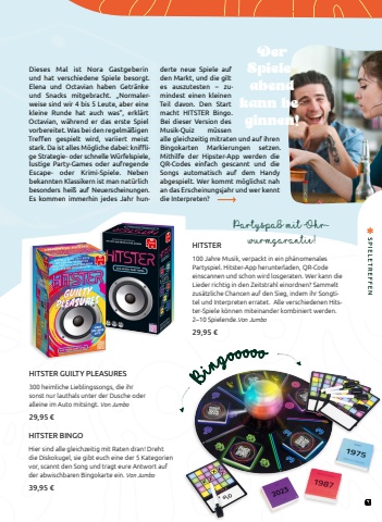 BingoooooBingoooooHITSTER BINGOHier sind alle gleichzeitig mit Raten dran! Dreht die Diskokugel, sie gibt euch eine der 5 Kategorien vor, scannt den Song und tragt eure Antwort auf der abwischbaren Bingokarte ein. Von Jumbo39,95 %u20acHITSTER GUILTY PLEASURES300 heimliche Lieblingssongs, die ihr sonst nur lauthals unter der Dusche oder alleine im Auto mitsingt. Von Jumbo29,95 %u20acHITSTER100 Jahre Musik, verpackt in ein ph%u00e4nomenales Partyspiel. Hitster-App herunterladen, QR-Code einscannen und schon wird losgeraten. Wer kann die Lieder richtig in den Zeitstrahl einordnen? Sammelt zus%u00e4tzliche Chancen auf den Sieg, indem ihr Songtitel und Interpreten erratet. Alle verschiedenen Hitster-Spiele k%u00f6nnen miteinander kombiniert werden. 2%u201310 Spielende.Von Jumbo29,95 %u20acDer Spieleabend kann beginnen!Dieses Mal ist Nora Gastgeberin und hat verschiedene Spiele besorgt. Elena und Octavian haben Getr%u00e4nke und Snacks mitgebracht. %u201eNormalerweise sind wir 4 bis 5 Leute, aber eine kleine Runde hat auch was%u201c, erkl%u00e4rt Octavian, w%u00e4hrend er das erste Spiel vorbereitet. Was bei den regelm%u00e4%u00dfigen Treffen gespielt wird, variiert meiststark. Da ist alles M%u00f6gliche dabei: knifflige Strategie- oder schnelle W%u00fcrfelspiele,lustige Party-Games oder aufregende Escape- oder Krimi-Spiele. Neben bekannten Klassikern ist man nat%u00fcrlich besonders hei%u00df auf Neuerscheinungen.Es kommen immerhin jedes Jahr hunderte neue Spiele auf den Markt, und die gilt es auszutesten %u2013 zumindest einen kleinen Teil davon. Den Start macht HITSTER Bingo. Bei dieser Version des Musik-Quiz m%u00fcssen alle gleichzeitig mitraten und auf ihren Bingokarten Markierungen setzen. Mithilfe der Hipster-App werden die QR-Codes einfach gescannt und die Songs automatisch auf dem Handy abgespielt. Wer kommt m%u00f6glichst nah an das Erscheinungsjahr und wer kennt die Interpreten? Partyspa%u00df mit Ohrwurmgarantie! 63