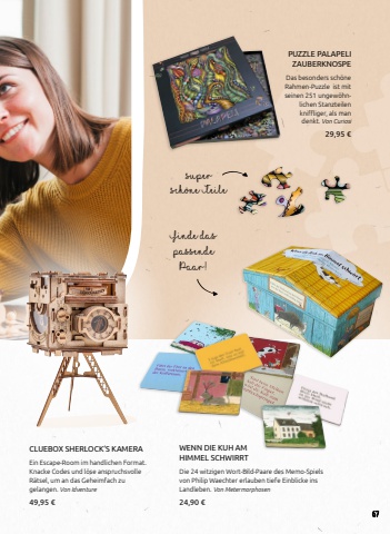 CLUEBOX SHERLOCK%u2018S KAMERAEin Escape-Room im handlichen Format. Knacke Codes und l%u00f6se anspruchsvolle R%u00e4tsel, um an das Geheimfach zu gelangen. Von Idventure49,95 %u20acPUZZLE PALAPELI ZAUBERKNOSPEDas besonders sch%u00f6ne Rahmen-Puzzle ist mit seinen 251 ungew%u00f6hnlichen Stanzteilen kniffliger, als man denkt. Von Curiosi29,95 %u20acWENN DIE KUH AM HIMMEL SCHWIRRTDie 24 witzigen Wort-Bild-Paare des Memo-Spiels von Philip Waechter erlauben tiefe Einblicke ins Landleben. Von Metermorphosen24,90 %u20acFinde das passende Paar!super sch%u00f6ne Teile67