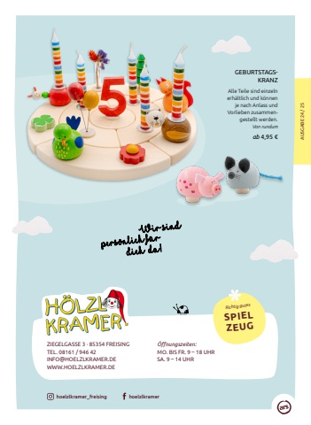 GEBURTSTAGSKRANZAlle Teile sind einzeln erh%u00e4ltlich und k%u00f6nnen je nach Anlass und Vorlieben zusammengestellt werden. Von rundumab 4,95 %u20ac AUSGABE 24 / 25 Wir sind pers%u00f6nlich f%u00fcr dich da!ZIEGELGASSE 3 %u00b7 85354 FREISINGTEL. 08161 / 946 42INFO@HOELZLKRAMER.DEWWW.HOELZLKRAMER.DE%u00d6ffnungszeiten:MO. BIS FR. 9 %u2013 18 UHRSA. 9 %u2013 14 UHRRichtig gutesSPIELZEUGhoelzlkramer_freising hoelzlkramer