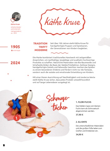 Die Marke kombiniert traditionelles Handwerk mit zeitgem%u00e4%u00dfen Anspr%u00fcchen, um nachhaltige, langlebige und qualitativ hochwertige Produkte zu schaffen. Nat%u00fcrliche Materialien wie Bio-Baumwolle und Schafwolle bilden die Basis der Waldorf-Kollektion. Zeitlose Designs, handgefertigte Details und liebevolle Gesichter machen das Spielen zu einem besonderen Erlebnis und f%u00f6rdern nicht nur die Fantasie, sondern auch die soziale und emotionale Entwicklung von Kindern. Mit einer klaren Ausrichtung auf Nachhaltigkeit und moderne Werte stellt K%u00e4the Kruse sicher, dass jedes Produkt umweltfreundlichund auf lange Lebensdauer ausgelegt ist. TRADITION TRIFFT MODERNESeit %u00fcber 100 Jahren steht K%u00e4the Kruse f%u00fcr handgefertigte Puppen und Spielwaren, die Generationen von Kindern begleiten. K%u00e4the Kruse6-fache Mutter und Unternehmensgr%u00fcnderin; ca. 1925erste Puppe20242. ELI ENTEDie unterschiedlichen Materialien und die gro%u00dfen F%u00fc%u00dfe laden zum Greifen und Entdecken ein.34,90 %u20ac1. FLORI FUCHSDas Helden-Cape vom kleinen Fuchs kann als Schmusetuch abgenommen werden.37,90 %u20ac1905Schmuse- t%u00fccher1.2.10