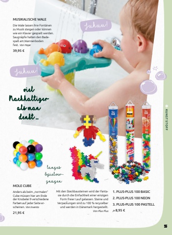 MOLE CUBEAnders als beim %u201enormalen%u201c Cube m%u00fcssen hier am Ende der Knobelei 9 verschiedene Farben auf jeder Seite erscheinen. Von Invento21,95 %u20acMUSIKALISCHE WALEDie Wale lassen ihre Font%u00e4nen zu Musik steigen oder k%u00f6nnen wie ein Klavier gespielt werden. Saugn%u00e4pfe halten den Badespa%u00df am Wannenboden fest. Von Hape39,95 %u20acMit den Steckbausteinen wird der Fantasie durch die Einfachheit einer einzigen Form freier Lauf gelassen. Steine und Verpackungen sind zu 100 % recycelbar und werden in D%u00e4nemark hergestellt. Von Plus Plus1. PLUS-PLUS 100 BASIC2. PLUS-PLUS 100 NEON3. PLUS-PLUS 100 PASTELLje 8,95 %u20acviel Nachhaltiger als man denkt ...langes Spielvergn%u00fcgenJuhuu!Juhuu!55 KUNSTSTOFF