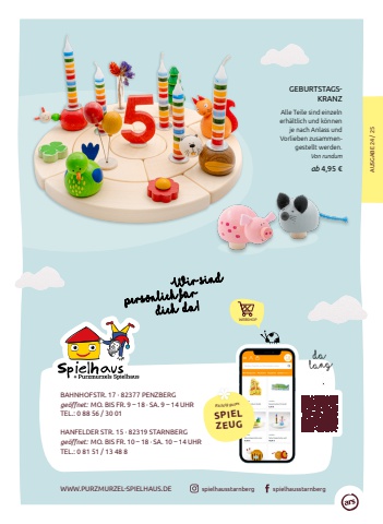 GEBURTSTAGSKRANZAlle Teile sind einzeln erh%u00e4ltlich und k%u00f6nnen je nach Anlass und Vorlieben zusammengestellt werden. Von rundumab 4,95 %u20ac AUSGABE 24 / 25 Wir sind pers%u00f6nlich f%u00fcr dich da!WEBSHOP dalangRichtig gutesSPIELZEUGWWW.PURZMURZEL-SPIELHAUS.DE spielhausstarnberg spielhausstarnbergBAHNHOFSTR. 17 %u00b7 82377 PENZBERGge%u00f6ffnet: MO. BIS FR. 9 %u2013 18 %u00b7 SA. 9 %u2013 14 UHRTEL.: 0 88 56 / 30 01HANFELDER STR. 15 %u00b7 82319 STARNBERGge%u00f6ffnet: MO. BIS FR. 10 %u2013 18 %u00b7 SA. 10 %u2013 14 UHRTEL.: 0 81 51 / 13 48 8
