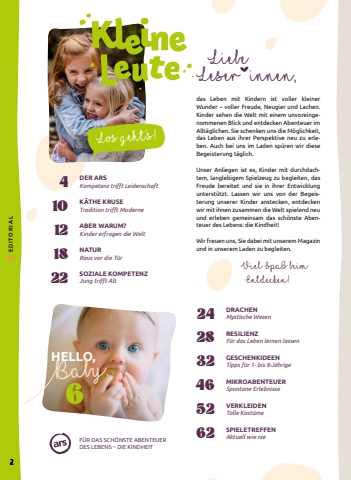 das Leben mit Kindern ist voller kleiner Wunder %u2013 voller Freude, Neugier und Lachen. Kinder sehen die Welt mit einem unvoreingenommenen Blick und entdecken Abenteuer im Allt%u00e4glichen. Sie schenken uns die M%u00f6glichkeit, das Leben aus ihrer Perspektive neu zu erleben. Auch bei uns im Laden sp%u00fcren wir diese Begeisterung t%u00e4glich.Unser Anliegen ist es, Kinder mit durchdachtem, langlebigem Spielzeug zu begleiten, das Freude bereitet und sie in ihrer Entwicklung unterst%u00fctzt. Lassen wir uns von der Begeisterung unserer Kinder anstecken, entdecken wir mit ihnen zusammen die Welt spielend neu und erleben gemeinsam das sch%u00f6nste Abenteuer des Lebens: die Kindheit!Wir freuen uns, Sie dabei mit unserem Magazin und in unserem Laden zu begleiten.Los geht%u00b4s! LiebeLeser*innen,F%u00dcR DAS SCH%u00d6NSTE ABENTEUER DES LEBENS %u2013 DIE KINDHEIT18 NATURRaus vor die T%u00fcr46 MIKROABENTEUERSpontane Erlebnisse62 SPIELETREFFENAktuell wie nie52 VERKLEIDENTolle Kost%u00fcme28 RESILIENZF%u00fcr das Leben lernen lassen24 DRACHENMystische Wesen32 GESCHENKIDEENTipps f%u00fcr 1- bis 8-J%u00e4hrigeViel Spa%u00df beim Entdecken!4 DER ARSKompetenz trifft Leidenschaft 12 ABER WARUM?Kinder erfragen die Welt10 K%u00c4THE KRUSETradition trifft Moderne22 SOZIALE KOMPETENZJung trifft Alt6HELLO, Baby.2EDITORIAL
