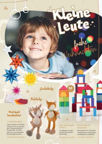 1. FENSTERSTERNEDurch Faltplan und Klebeschablone ist das Basteln der Transparentsterne kinderleicht. Die Sets gibt es in verschiedenen Schwierigkeitsstufen. Von Fensterstern | 6,95 %u20acGEOMETRISCHE BAUKL%u00d6TZEBaumaterial f%u00fcr 1000 Spielm%u00f6glichkeiten. 60 Baukl%u00f6tze aus lasiertem Lindenholz. Von Grimm%u00b4s | 62,95 %u20acREH-, FUCHS BABY VANILLAKnuddelige KuschelKumpel aus weicher Baumwolle. Von Sigikid | je 32,95 %u20acRehbabyFuchsbabyViel Spa%u00df beim Basteln!60 TEILE frohe Weihnachten
