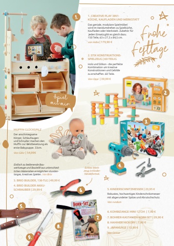 Frohe Festtage1. CREATIVE PLAY 3IN1-K%u00dcCHE, KAUFLADEN UND WERKSTATTDas geniale, modulare Spielm%u00f6bel wird im Handumdrehen zu Spielk%u00fcche, Kaufladen oder Werkstatt. Zubeh%u00f6r f%u00fcr jeden Einsatz gibt es gleich dazu. 150 Teile, 63 x 27,5 x 84,5 cm. von Haba | 179,90 %u20ac5. KINDERSCHNITZMESSER | 23,95 %u20acRobustes, hochwertiges Kinderschnitzmesser mit abgerundeter Spitze und Abrutschschutz. Von rundum9 .8 .6.7.6. KOMBIZANGE MINI 12 CM | 7,90 %u20ac7. BOHRER-KASTANIEN-KORK-SET | 29,90 %u20ac8. HAMMER HICKORY | 7,90 %u20ac9. JAPANS%u00c4GE | 13,90 %u20acVon Corvus3. BRIO BUILDER, 136-TLG | 49,99 %u20ac4. BRIO BUILDER AKKUSCHRAUBER | 29,99 %u20acEchtes Werkzeug in Kinderh%u00e4ndeformat. Einfach zu bedienende Bauwerkzeuge und Bauteile aus unterschiedlichen Materialien erm%u00f6glichen stundenlanges, kreatives Spielen. Von Brio2. STIX KONSTRUKTIONSSPIELZEUG | 60-TEILIGHolz und Silikon - die perfekte Kombination um kreative Konstruktionen und Gebilde zu erschaffen. 60 Teile. Von Oppi | 39,99 %u20acMUFFIN GL%u00dcCKSPILZDer anschmiegsame K%u00f6rper, Schlaufaugen und Schnuller machen den Muffin zur Bestbesetzung als erste Babypuppe. 33cm. Von G%u00f6tz | 54,99%u20ac Spiel mit mir.4 .3 .2.1 .5 .