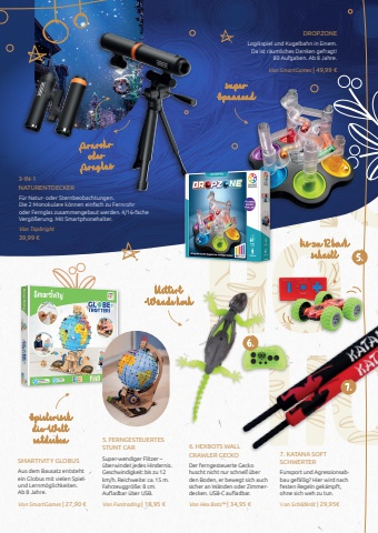 Fernrohroder Fernglassuper Spannendklettert W%u00e4nde hochSpielerisch die Welt entdeckenbis zu 12 km/h schnell7. KATANA SOFT SCHWERTERFunsport und Agressionsabbau gef%u00e4llig? Hier wird nach festen Regeln gek%u00e4mpft, ohne sich weh zu tun. Von Schildkr%u00f6t | 29,95%u20ac5. FERNGESTEUERTES STUNT CARSuper-wendiger Flitzer %u2013 %u00fcberwindet jedes Hindernis.Geschwindigkeit: bis zu 12 km/h. Reichweite: ca.15 m. Fahrzeuggr%u00f6%u00dfe: 8 cm. Aufladbar %u00fcber USB. Von Funtrading | 18,95 %u20ac6. HEXBOTS WALL CRAWLER GECKODer ferngesteuerte Gecko huscht nicht nur schnell %u00fcber den Boden, er bewegt sich auch sicher an W%u00e4nden oder Zimmerdecken. USB-C aufladbar. Von Hex Bots%u2122 | 34,95 %u20acSMARTIVITY GLOBUSAus dem Bausatz entsteht ein Globus mit vielen Spielund Lernm%u00f6glichkeiten. Ab 8 Jahre. Von SmartGames | 27,90 %u20ac3-IN-1 NATURENTDECKERF%u00fcr Natur- oder Sternbeobachtungen. Die 2 Monokulare k%u00f6nnen einfach zu Fernrohr oder Fernglas zusammengebaut werden. 4/16-fache Verg%u00f6%u00dferung. Mit Smartphonehalter. Von Topbright39,99 %u20acDROPZONELogikspiel und Kugelbahn in Einem. Da ist r%u00e4umliches Denken gefragt! 80 Aufgaben. Ab 8 Jahre. Von SmartGames | 49,99 %u20ac5 .7 .6 .