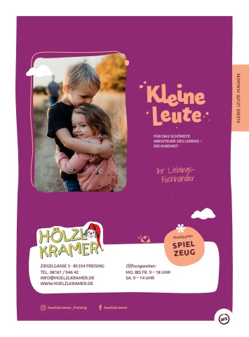 KLEINE LEUTE MAGAZINZIEGELGASSE 3 %u00b7 85354 FREISINGTEL. 08161 / 946 42INFO@HOELZLKRAMER.DEWWW.HOELZLKRAMER.DE%u00d6ffnungszeiten:MO. BIS FR. 9 %u2013 18 UHRSA. 9 %u2013 14 UHRhoelzlkramer_freisinghoelzlkramerF%u00dcR DAS SCH%u00d6NSTE ABENTEUER DES LEBENS %u2013 DIE KINDHEITIhr Lieblings- Fachh%u00e4ndlerRichtig gutesSPIELZEUG