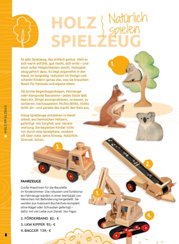 1 .FAHRZEUGEGro%u00dfe Maschinen f%u00fcr die Baustelle im Kinderzimmer: Die robusten und funktionalen Fahrzeuge werden in einer Werkstatt von Menschen mit Behinderung hergestellt. Sie werden aus massivem Buchenholz komplett ohne N%u00e4gel oder Schrauben gefertigt %u2013 daf%u00fcr mit viel Liebe zum Detail. Von Fagus2. F%u00d6RDERBAND 82,- %u20ac3. LKW KIPPER 95,- %u20ac4. BAGGER 139,- %u20acEs gibt Spielzeug, das einfach guttut. Weil es sich warm anf%u00fchlt, gut riecht, still wirkt %u2013 und doch voller M%u00f6glichkeiten steckt. Holzspielzeug geh%u00f6rt dazu. Es liegt angenehm in der Hand, ist langlebig, reduziert im Design und schenkt Kindern genau das, was sie brauchen: Raum f%u00fcr Fantasie und eigene Ideen.Ob bunte Regenbogenb%u00f6gen, Fahrzeuge oder klangvolle Bausteine %u2013 jedes St%u00fcck l%u00e4dt dazu ein, Dinge auszuprobieren, zu bauen, zu sortieren, nachzuspielen. Nichts blinkt, nichts lenkt ab %u2013 und gerade das macht den Reiz aus.Diese Spielzeuge entstehen in Handarbeit, aus heimischen H%u00f6lzern, gefertigt mit Sorgfalt und Verantwortung. Sie begleiten Kinder nicht nur durch eine Spielphase, sondern oft %u00fcber viele Jahre hinweg. Nat%u00fcrlich. Sinnvoll. Sch%u00f6n.HOLZ SPIELZEUGNat%u00fcrlich spielen8 HOLZSPIELZEUG