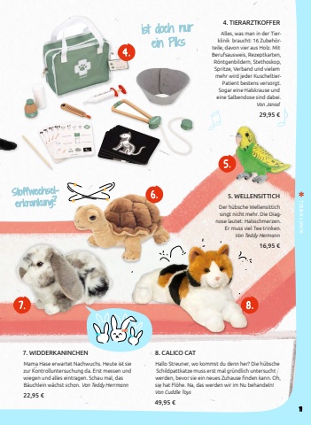 Stoffwechselerkrankung?ist doch nur ein Piks5. WELLENSITTICHDer h%u00fcbsche Wellensittich singt nicht mehr. Die Diagnose lautet: Halsschmerzen. Er muss viel Tee trinken.Von Teddy Hermann16,95 %u20ac7. WIDDERKANINCHENMama Hase erwartet Nachwuchs. Heute ist sie zur Kontrolluntersuchung da. Erst messen und wiegen und alles eintragen. Schau mal, das B%u00e4uchlein w%u00e4chst schon. Von Teddy Herrmann22,95 %u20ac4. TIERARZTKOFFERAlles, was man in der Tierklinik braucht: 16 Zubeh%u00f6rteile, davon vier aus Holz. Mit Berufsausweis, Rezeptkarten, R%u00f6ntgenbildern, Stethoskop, Spritze, Verband und vielem mehr wird jeder KuscheltierPatient bestens versorgt. Sogar eine Halskrause und eine Salbendose sind dabei. Von Janod29,95 %u20ac7 .5 .4 .Wackelwatte,zahn :(8 .6 .8. CALICO CATHallo Streuner, wo kommst du denn her? Die h%u00fcbsche Schildpattkatze muss erst mal gr%u00fcndlich untersucht werden, bevor sie ein neues Zuhause finden kann. Oh, sie hat Fl%u00f6he. Na, das werden wir im Nu behandeln! Von Cuddle Toys49,95 %u20ac11 TIERKLINIK