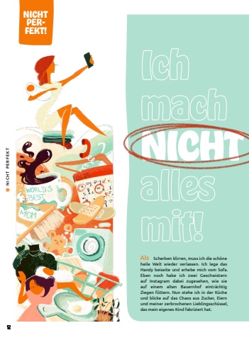Als Scherben klirren, muss ich die sch%u00f6neheile Welt wieder verlassen. Ich lege das Handy beiseite und erhebe mich vom Sofa. Eben noch habe ich zwei Geschwistern auf Instagram dabei zugesehen, wie sie auf einem alten Bauernhof eintr%u00e4chtig Ziegen f%u00fcttern. Nun stehe ich in der K%u00fccheund blicke auf das Chaos aus Zucker, Eiernund meiner zerbrochenen Lieblingssch%u00fcssel, das mein eigenes Kind fabriziert hat.NICHTPERFEKT!Ich mach NICHTalles mit!12NICHT PERFEKT