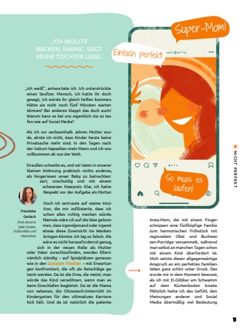 %u201eIch wei%u00df%u201c, antwortete ich. Ich unterdr%u00fcckte einen Seufzer. Mensch, ich hatte ihr doch gesagt, ich w%u00fcrde ihr gleich helfen kommen. H%u00e4tte sie nicht noch f%u00fcnf Minuten warten k%u00f6nnen? Bei anderen klappt das doch auch! Warum kann es bei uns eigentlich nie so laufen wie auf Social Media?Als ich vor sechseinhalb Jahren Mutter wurde, ahnte ich nicht, dass Kinder heute keine Privatsache mehr sind. In den Tagen nach der Geburt kapselten mein Mann und ich uns vollkommen ab von der Welt.Drau%u00dfen schneite es, und wir taten in unserer kleinen Wohnung praktisch nichts anderes, als hingerissen unser Baby zu betrachten: zart, unschuldig und mit einem schwarzen Haarputz. Klar, ich hatte Respekt vor der Aufgabe als Mutter. Doch ich vertraute auf meine Intuition, die mir zufl%u00fcsterte, dass ich schon alles richtig machen w%u00fcrde. Niemals w%u00e4re ich auf die Idee gekommen, dass irgendjemand oder irgendetwas diese Zuversicht ins Wanken bringen k%u00f6nnte. Ich lag so falsch. Als w%u00e4re es nicht herausfordernd genug, sich in der neuen Rolle als Mutter oder Vater zurechtzufinden, werden Eltern n%u00e4mlich st%u00e4ndig %u2013 auf Spielpl%u00e4tzen genauso wie in den sozialen Medien %u2013 mit Erwartungen konfrontiert, die oft als Ratschl%u00e4ge getarnt werden. Da ist die Oma, die meint, man w%u00fcrde das Kind verw%u00f6hnen, wenn man es beim Einschlafen begleitet. Da ist die Mama von nebenan, die Chinesisch-Unterricht im Kindergarten f%u00fcr den ultimativen Karrierekick h%u00e4lt. Und da ist nat%u00fcrlich die patente %u201eICH WOLLTE BACKEN, MAMA%u201c, SAGT MEINE TOCHTER LEISE.Insta-Mom, die mit einem Fingerschnipsen eine f%u00fcnfk%u00f6pfige Familie zum harmonischen Fr%u00fchst%u00fcck mit regionalem Obst und Buchweizen-Porridge versammelt, w%u00e4hrend man selbst an manchen Tagen schon mit einem Kind %u00fcberfordert ist. Mich setzte dieser allgegenw%u00e4rtige Anspruch an ein perfektes Familienleben ganz sch%u00f6n unter Druck. Das wurde mir in dem Moment bewusst, als ich mit Ei-Glibber am Schwamm auf dem K%u00fcchenboden kniete. Pl%u00f6tzlich hatte ich das Gef%u00fchl, den Meinungen anderer und Social Media %u00fcberm%u00e4%u00dfig viel Bedeutung Einfach perfekt!So muss es laufen!Super-Mom!Franziska Gerlach freie Autorin liebt Kinder, Kulturelles und Menschen Ich mach NICHTalles mit!13NICHT PERFEKT