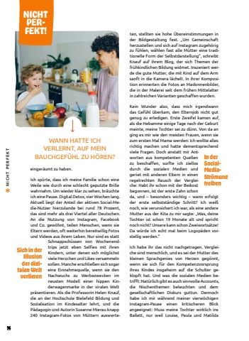 einger%u00e4umt zu haben. Ich sp%u00fcrte, dass ich meine Familie schon eine Weile wie durch eine schlecht geputzte Brille wahrnahm. Um wieder klar zu sehen, br%u00e4uchte ich eine Pause. Digital Detox, vier Wochen lang. Aktuell liegt der Anteil der aktiven Social-Media-Nutzer hierzulande bei rund 78 Prozent, das sind mehr als drei Viertel aller Deutschen. An die Nutzung von Instagram, Facebook und Co. gew%u00f6hnt, teilen Menschen, wenn sie Eltern werden, oft weiterhin bereitwillig Fotos und Videos aus ihrem Leben. Nur sind es statt Schnappsch%u00fcssen von Wochenendtrips jetzt eben Selfies mit ihren Kindern, unter denen sich m%u00f6glichst viele Herzchen und Likes versammeln sollen. Manche erschlie%u00dfen sich sogar eine Einnahmequelle, wenn sie den Nachwuchs zu Werbezwecken im neusten Modell einer hippen Kinderwagenmarke in der viralen Welt pr%u00e4sentieren. Als die Professorin Helen Knauf, die an der Hochschule Bielefeld Bildung und Sozialisation im Kindesalter lehrt, und die P%u00e4dagogin und Autorin Susanne Mierau knapp 240 Instagram-Fotos von M%u00fcttern auswerteten, stellten sie hohe %u00dcbereinstimmungen in der Bildgestaltung fest. %u201eUm Gemeinschaft herzustellen und sich auf Instagram zugeh%u00f6rig zu f%u00fchlen, w%u00e4hlen fast alle M%u00fctter eine traditionelle Form der Selbstdarstellung%u201c, schreibt Knauf auf ihrem Blog, der sich Themen der fr%u00fchkindlichen Bildung widmet. Inszeniert werde die gute Mutter, die mit Kind auf dem Arm sanft in die Kamera l%u00e4chelt. In ihrer Komposition erinnerten die Fotos an Madonnenbilder, die in der Malerei seit dem fr%u00fchen Mittelalter in zahlreichen Varianten geschaffen wurden.Kein Wunder also, dass mich irgendwann das Gef%u00fchl %u00fcberkam, den Elternjob nicht gut genug zu erledigen. Erste Zweifel kamen auf, als die Hebamme einige Tage nach der Geburt meinte, meine Tochter sei zu d%u00fcnn. Von da an ging es mir wie den meisten Frauen, wenn sie zum ersten Mal Mama werden: Ich wollte alles richtig machen und hatte dementsprechend viele Fragen. Doch anstatt mir Antworten aus kompetenten Quellen zu beschaffen, surfte ich ziellos durch die sozialen Medien und geriet mit anderen Eltern in einen regelrechten Rausch der Vergleiche: Habt ihr schon mit der Beikost begonnen, ist der erste Zahn schon da, und %u2013 besonders wichtig %u2013 wann erfolgt der erste selbstst%u00e4ndige Schritt? Ich wei%u00df noch, wie verunsichert ich war, als eine andere Mutter aus der Kita zu mir sagte: %u201eWas, deine Tochter ist schon 19 Monate alt und spricht noch nicht? Unsere kann schon Zweiworts%u00e4tze! Da w%u00fcrde ich echt mal beim Logop%u00e4den vorstellig werden.%u201cIch habe ihr das nicht nachgetragen. Vergleiche sind menschlich, und es sei der Mutter des kleinen Sprachgenies von Herzen geg%u00f6nnt, wenn sie sich f%u00fcr den Kompetenzvorsprung ihres Kindes insgeheim auf die Schulter geklopft hat. Und was die sozialen Medien betrifft: Nat%u00fcrlich gibt es auch sinnvolle Accounts, die Nischenthemen beleuchten und dem gesellschaftlichen Diskurs guttun. Dennoch habe ich mir w%u00e4hrend meiner vierw%u00f6chigen Instagram-Pause einen kritischeren Blick angeeignet: Muss meine Tochter wirklich ins Ballett, nur weil Louise, Paula und Matilda WANN HATTE ICH VERLERNT, AUF MEIN BAUCHGEF%u00dcHL ZU H%u00d6REN? In der SocialMediaStr%u00f6mung treibenSich in der Illusion der digitalen Welt verlierenNICHTPERFEKT!14NICHT PERFEKT