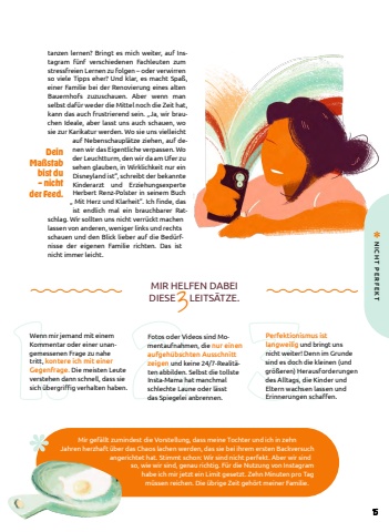 tanzen lernen? Bringt es mich weiter, auf Instagram f%u00fcnf verschiedenen Fachleuten zum stressfreien Lernen zu folgen %u2013 oder verwirren so viele Tipps eher? Und klar, es macht Spa%u00df, einer Familie bei der Renovierung eines alten Bauernhofs zuzuschauen. Aber wenn man selbst daf%u00fcr weder die Mittel noch die Zeit hat, kann das auch frustrierend sein. %u201eJa, wir brauchen Ideale, aber lasst uns auch schauen, wo sie zur Karikatur werden. Wo sie uns vielleicht auf Nebenschaupl%u00e4tze ziehen, auf denen wir das Eigentliche verpassen. Wo der Leuchtturm, den wir da am Ufer zu sehen glauben, in Wirklichkeit nur ein Disneyland ist%u201c, schreibt der bekannte Kinderarzt und Erziehungsexperte Herbert Renz-Polster in seinem Buch %u201e Mit Herz und Klarheit%u201d. Ich finde, das ist endlich mal ein brauchbarer Ratschlag. Wir sollten uns nicht verr%u00fcckt machen lassen von anderen, weniger links und rechts schauen und den Blick lieber auf die Bed%u00fcrfnisse der eigenen Familie richten. Das ist nicht immer leicht. MIR HELFEN DABEI DIESE LEITS%u00c4TZE. 3Mir gef%u00e4llt zumindest die Vorstellung, dass meine Tochter und ich in zehn Jahren herzhaft %u00fcber das Chaos lachen werden, das sie bei ihrem ersten Backversuch angerichtet hat. Stimmt schon: Wir sind nicht perfekt. Aber wir sind so, wie wir sind, genau richtig. F%u00fcr die Nutzung von Instagram habe ich mir jetzt ein Limit gesetzt. Zehn Minuten pro Tag m%u00fcssen reichen. Die %u00fcbrige Zeit geh%u00f6rt meiner Familie.Dein Ma%u00dfstab bist du %u2013 nicht der Feed.1. 2. 3. Wenn mir jemand mit einem Kommentar oder einer unangemessenen Frage zu nahe tritt, kontere ich mit einer Gegenfrage. Die meisten Leute verstehen dann schnell, dass sie sich %u00fcbergriffig verhalten haben.Perfektionismus ist langweilig und bringt uns nicht weiter! Denn im Grunde sind es doch die kleinen (und gr%u00f6%u00dferen) Herausforderungen des Alltags, die Kinder und Eltern wachsen lassen und Erinnerungen schaffen. Fotos oder Videos sind Momentaufnahmen, die nur einen aufgeh%u00fcbschten Ausschnitt zeigen und keine 24/7-Realit%u00e4ten abbilden. Selbst die tollste Insta-Mama hat manchmal schlechte Laune oder l%u00e4sst das Spiegelei anbrennen. 15NICHT PERFEKT