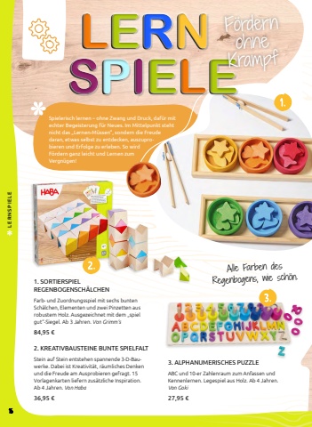 1 .3 .2 . LERN SPIELE3. ALPHANUMERISCHES PUZZLEABC und 10-er Zahlenraum zum Anfassen und Kennenlernen. Legespiel aus Holz. Ab 4 Jahren. Von Goki27,95 %u20ac1. SORTIERSPIEL REGENBOGENSCH%u00c4LCHENFarb- und Zuordnungsspiel mit sechs bunten Sch%u00e4lchen, Elementen und zwei Pinzetten aus robustem Holz. Ausgezeichnet mit dem %u201espiel gut%u201c-Siegel. Ab 3 Jahren. Von Grimm%u2018s 84,95 %u20ac2. KREATIVBAUSTEINE BUNTE SPIELFALTStein auf Stein entstehen spannende 3-D-Bauwerke. Dabei ist Kreativit%u00e4t, r%u00e4umliches Denken und die Freude am Ausprobieren gefragt. 15 Vorlagenkarten liefern zus%u00e4tzliche Inspiration. Ab 4 Jahren. Von Haba 36,95 %u20acSpielerisch lernen %u2013 ohne Zwang und Druck, daf%u00fcr mit echter Begeisterung f%u00fcr Neues. Im Mittelpunkt steht nicht das %u201eLernen-M%u00fcssen%u201c, sondern die Freude daran, etwas selbst zu entdecken, auszuprobieren und Erfolge zu erleben. So wird F%u00f6rdern ganz leicht und Lernen zum Vergn%u00fcgen!F%u00f6rdern ohne Krampf Alle Farben des Regenbogens, wie sch%u00f6n.16LERNSPIELE