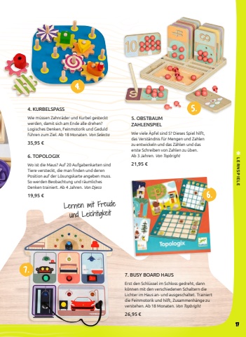 6 .5 .7 .4.5. OBSTBAUM ZAHLENSPIELWie viele %u00c4pfel sind 5? Dieses Spiel hilft, das Verst%u00e4ndnis f%u00fcr Mengen und Zahlen zu entwickeln und das Z%u00e4hlen und das erste Schreiben von Zahlen zu %u00fcben. Ab 3 Jahren. Von Topbright21,95 %u20ac7. BUSY BOARD HAUSErst den Schl%u00fcssel im Schloss gedreht, dann k%u00f6nnen mit den verschiedenen Schaltern die Lichter im Haus an- und ausgeschaltet. Trainiert die Feinmotorik und hilft, Zusammenh%u00e4nge zu verstehen. Ab 18 Monaten. Von Topbright 26,95 %u20ac4. KURBELSPASSWie m%u00fcssen Zahnr%u00e4der und Kurbel gesteckt werden, damit sich am Ende alle drehen? Logisches Denken, Feinmotorik und Geduld f%u00fchren zum Ziel. Ab 18 Monaten. Von Selecta35,95 %u20ac6. TOPOLOGIXWo ist die Maus? Auf 20 Aufgabenkarten sind Tiere versteckt, die man finden und deren Position auf der L%u00f6sungskarte angeben muss. So werden Beobachtung und r%u00e4umliches Denken trainiert. Ab 4 Jahren. Von Djeco19,95 %u20acLernen mit Freude und Leichtigkeit17LERNSPIELE