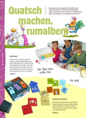 PATENTE PATENTEBriefmarken-Leckmaschine oder Rasenm%u00e4her-Dreirad: 36 kuriose Patent-Flops aus den letzten 100 Jahren in einem Memo-Spiel mit Original-Zeichnungen. Von Metermorphosen24,95 %u20acEIERTANZEiersammeln %u2013 schwer gemacht! Denn je nach W%u00fcrfelvorgabe muss das Ei mal unters Kinn, mal unter die Achsel geklemmt werden. Und dann auch noch einmal um den Tisch rennen!? Rasantes und herrlich albernes Aktionsspiel ab 5 Jahren. Von Haba19,95 %u20acDas Leben ist ernst genug! Rumalbern und Quatsch machen ist dann das beste Rezept gegen schlechte Laune. Kinder sind Weltmeister Quatsch darin und stecken uns Gro%u00dfe gerne damit an. machen, rumalbernWie ulkig!Zum Gl%u00fcck keine echten Eier. 18GUTE LAUNE