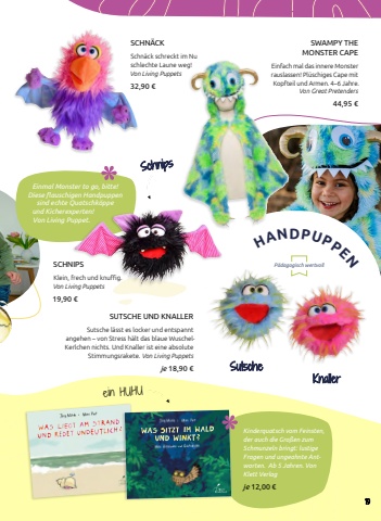 %u00bb %u2026 auf eine Art lustig, von der Kinder nicht genug kriegen k%u00f6nnen.%u00ab S%u00fcddeutsche Zeitung%u20ac 9,95 [D] %u20ac 10,30 [A]KnallerSutscheSWAMPY THE MONSTER CAPEEinfach mal das innere Monster rauslassen! Pl%u00fcschiges Cape mit Kopfteil und Armen. 4%u20136 Jahre. Von Great Pretenders44,95 %u20acSCHN%u00c4CKSchn%u00e4ck schreckt im Nu schlechte Laune weg! Von Living Puppets32,90 %u20acSCHNIPSKlein, frech und knuffig. Von Living Puppets19,90 %u20acSUTSCHE UND KNALLERSutsche l%u00e4sst es locker und entspannt angehen %u2013 von Stress h%u00e4lt das blaue WuschelKerlchen nichts. Und Knaller ist eine absolute Stimmungsrakete. Von Living Puppetsje 18,90 %u20acKinderquatsch vom Feinsten, der auch die Gro%u00dfen zum Schmunzeln bringt: lustige Fragen und ungeahnte Antworten. Ab 5 Jahren. Von Klett Verlagje 12,00 %u20acein HUHUEinmal Monster to go, bitte! Diese flauschigen Handpuppen sind echte Quatschk%u00f6ppe und Kicherexperten! Von Living Puppet.SchnipsHANDPUPPENP%u00e4dagogisch wertvoll19