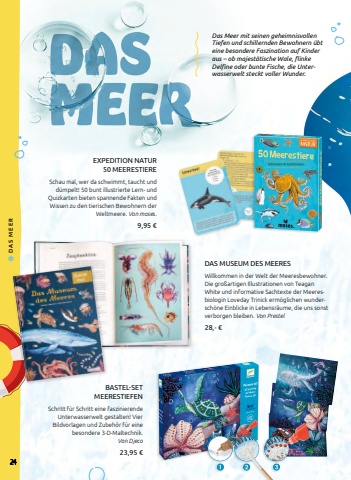 BASTEL-SET MEERESTIEFENSchritt f%u00fcr Schritt eine faszinierende Unterwasserwelt gestalten! Vier Bildvorlagen und Zubeh%u00f6r f%u00fcr eine besondere 3-D-Maltechnik. Von Djeco23,95 %u20acDAS MUSEUM DES MEERESWillkommen in der Welt der Meeresbewohner. Die gro%u00dfartigen Illustrationen von Teagan White und informative Sachtexte der Meeresbiologin Loveday Trinick erm%u00f6glichen wundersch%u00f6ne Einblicke in Lebensr%u00e4ume, die uns sonst verborgen bleiben. Von Prestel28,- %u20acEXPEDITION NATUR 50 MEERESTIERESchau mal, wer da schwimmt, taucht und d%u00fcmpelt! 50 bunt illustrierte Lern- und Quizkarten bieten spannende Fakten und Wissen zu den tierischen Bewohnern der Weltmeere. Von moses.9,95 %u20acDas Meer mit seinen geheimnisvollen Tiefen und schillernden Bewohnern %u00fcbt eine besondere Faszination auf Kinder aus %u2013 ob majest%u00e4tische Wale, flinke Delfine oder bunte Fische, die Unterwasserwelt steckt voller Wunder. 24DAS MEER