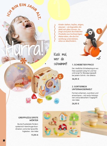 GREIFPUZZLE ERSTE W%u00d6RTERBunte Puzzleteile f%u00f6rdern spielerisch Hand-Auge-Koordination und erste Sprachf%u00e4higkeiten. Von Haba15,95 %u20ac2. SORTIERBOX UNTERWASSERWELTFormen erkennen, zuordnen und einsortieren %u2013 mit sechs Holzsteinen und praktischem Tragegriff. Von Haba26,95 %u20ac1. SCHIEBETIER PINGODer niedliche Schiebepinguin aus Holz wackelt lustig hin und her und sorgt f%u00fcr Bewegungsspa%u00df bei jedem Schritt. Von Selecta36,95 %u20acICH BIN EIN JAHR ALT.Kuck mal, wer da schwimmt!Kinder stehen, laufen, zeigen, staunen %u2013 sie begreifen die Welt mit allen Sinnen. Gefragt sind jetzt durchdachte Produkte aus hochwertigen Materialien, die die Entwicklung unterst%u00fctzen, ohne zu %u00fcberfordern. Hurra!1 .2 .30