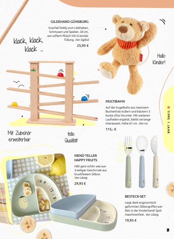 GILDEHARD G%u00dcNSBURGKuschel-Teddy zum Liebhaben, Schmusen und Spielen. 20 cm, aus softem Pl%u00fcsch mit Granulatf%u00fcllung. Von Sigikid25,95 %u20acMULTIBAHNAuf der Kugelbahn aus massivem Buchenholz kullern und klackern 3 bunte Ufos hinunter. Mit weiteren Laufteilen erg%u00e4nzt, bleibt sie lange interessant. H%u00f6he 67 cm. Von nic115,- %u20acBESTECK-SETLiegt dank ergonomisch geformten Silikongriffen perfekt in der Kinderhand! Sp%u00fclmaschinenfest. Von L%u00e4ssig19,95 %u20acMEN%u00dc-TELLER HAPPY FRUITSH%u00e4lt ganz sch%u00f6n was aus: 3-teiliges Geschirrset aus bruchfestem Silikon. Von L%u00e4ssig29,95 %u20acklack, klack, klack ...Hallo Kinder!Mit Zubeh%u00f6r erweiterbartolle Qualit%u00e4t31TIPPS 1 JAHR
