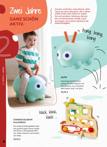 GANZ SCH%u00d6N AKTIV.SKIPPIHops-hops durchs Kinderzimmer! F%u00f6rdert Balance und Koordination. Aus robustem, BPA-freiem Vinyl. Von Quut39,95 %u20acSTANDKUGELBAHN KULLERRUMDie stabile Standkugelbahn l%u00e4sst drei gro%u00dfe Kugeln immer wieder aufs Neue in aufregenden Bahnen rollen, klackern und kreiseln. Von Haba39,95 %u20acboing, boing, boingklack, klack, klack ...2Zwei Jahre Staunen, entdecken, ausprobieren: Jeder Tag ist ein neues Abenteuer. Mit 2 Jahren wollen Kinder alles selbst tun, begreifen und verstehen. Spielzeug, das zum Mit- und Nachmachen einl%u00e4dt, weckt die Neugier und trainiert spielerisch die Selbstst%u00e4ndigkeit.32 TIPPS 2 JAHRE